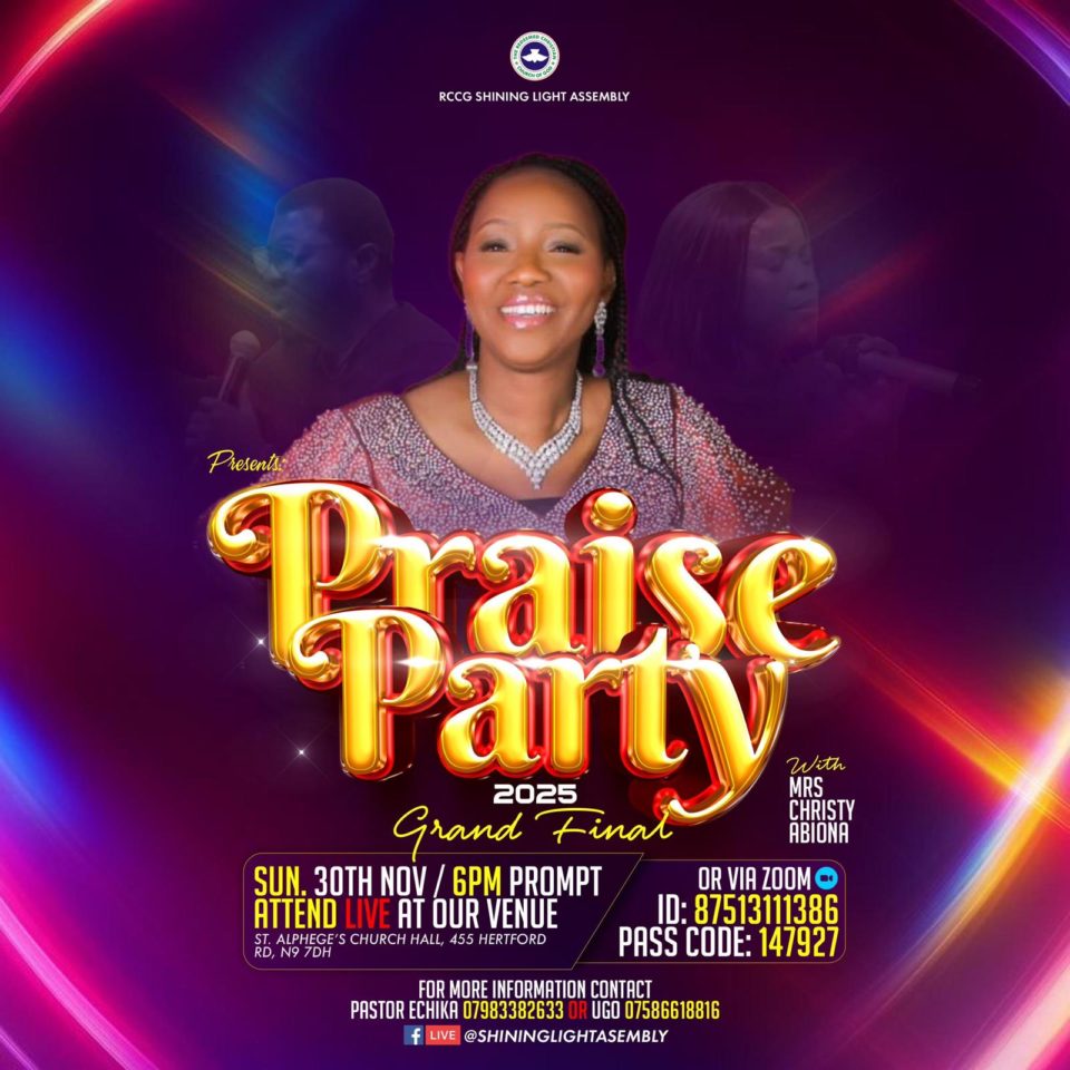 You are invited to our Sunday Praise Party for the month of November, 2025. An evening of praise and worship with Mrs Christy Abiona.